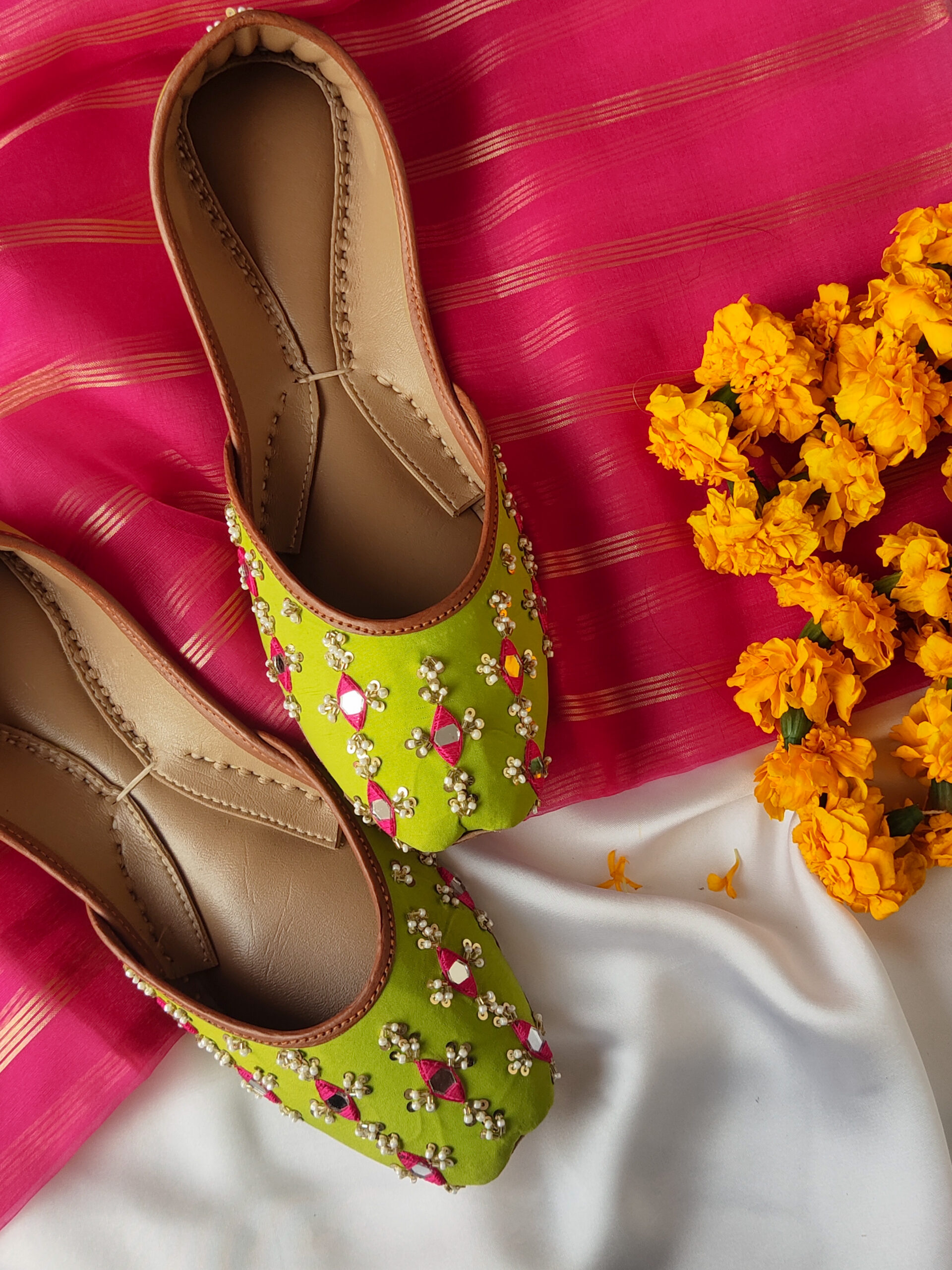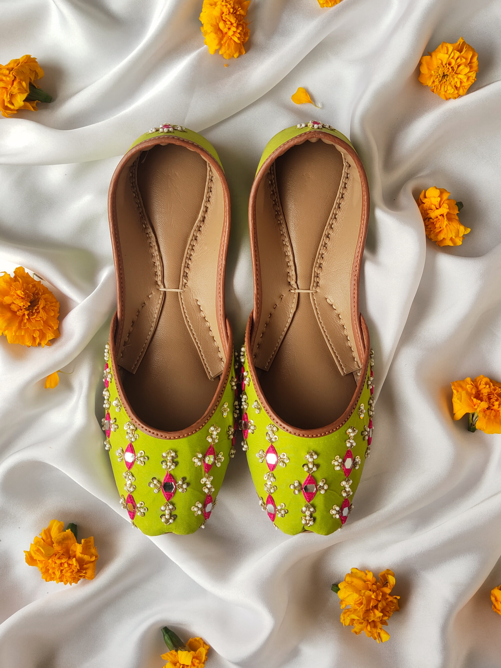 Neonic Green Mirror Khussa—Handmade Ethnic Flats